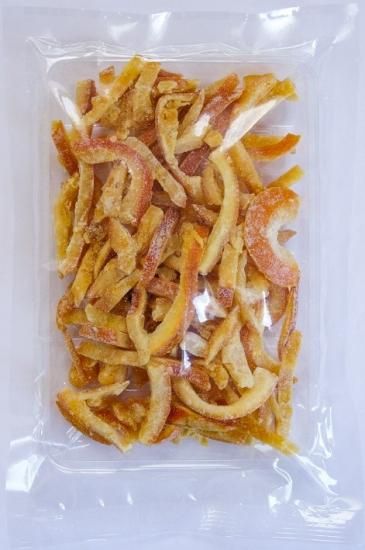 オレンジの皮だけ甘く味付けしたドライフルーツです。ほんのり苦みが利いてオレンジの香りが高いおいしいドライフルーツです。